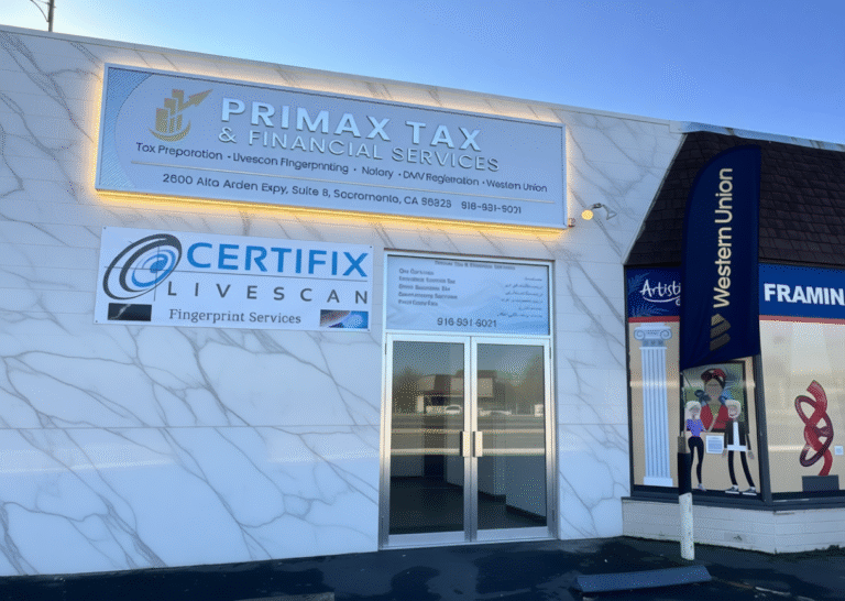 At Primax Tax & Financial Services, we believe in simplicity, accuracy, and trust. our Sacramento office at 2600 Alta Arden Expy, Suite B has helped thousands of individuals and businesses with a unique combination of services under one roof: IRS-compliant tax preparation, CA DOJ & FBI Livescan fingerprinting (via Certifix), notary public, passport photos, bookkeeping, Western Union, and payroll support.